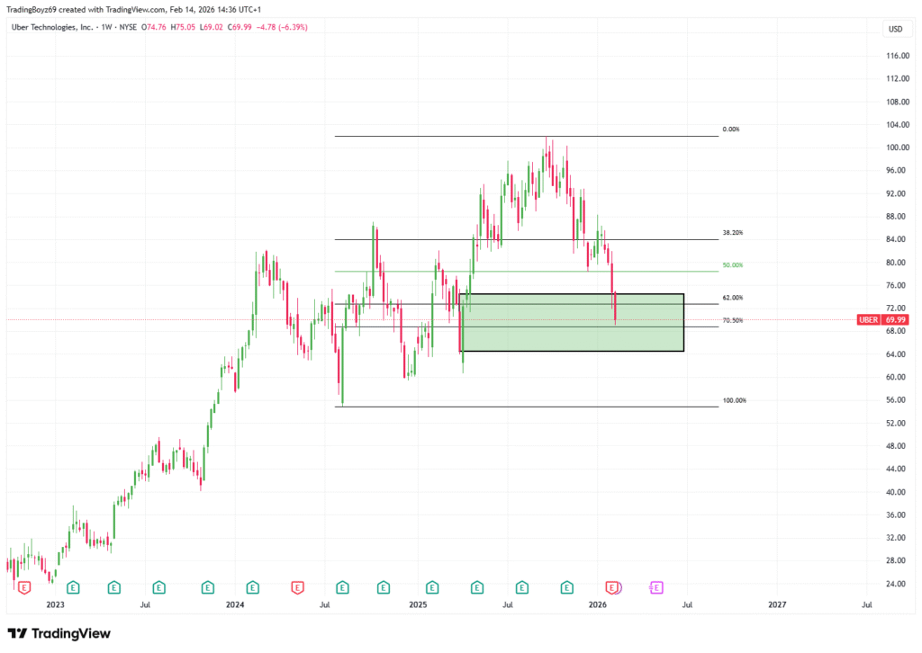 Akcie Uber mají za poslední léta za sebou poměrně silný růst, nicméně posledního půl roku spíše klesají a v minulém roce zde byly určitě i lepší alternativy. Momentálně se obchodují přibližně o 33 % níže oproti ATH a technicky se nacházejí jak v weekly demand zóně, tak zároveň v předchozím obchodním range.