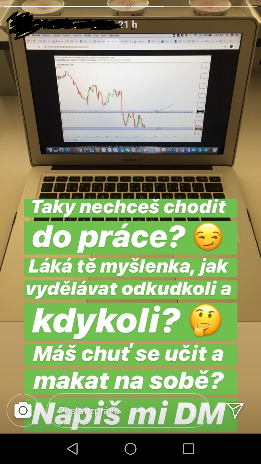 Pokud mám začít úplně od začátku, tak to začíná u osoby jejich leadera… Borec vždy prohlašoval, že nikdy dělat nebude, snažil se najít všechny různý způsoby, až došel k tomuto. Nějak to začalo, přetvářka na instagramu, všude velký prachy, kdo ví co. Pak to šlo dál, až to přerostlo do těch povrchních keců, které na ig dává teď, jak nechápe, že mu student řekne, že nemá 5k na počáteční investici…. Prostě mu to nevěřím a stejně tak to nevěřím nikomu z 18letých děcek, kteří mi na ig chtěj ukázat, jaký velký prachy vydělávaj, hlavně si tam napsal “Forex trader” a “CEO of my life” do bia. Když komukoliv z nich napíšeš, zda by ti řekl, co dělaj, tak tě akorát nasměrujou na svýho leadera s tím, že nic nechápou a neví.