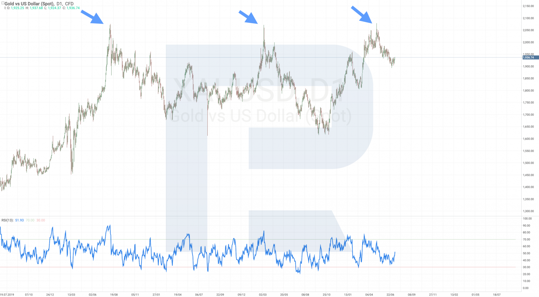 Na denním grafu XAU/USD se cena po otestování maxima v blízkosti 2 081 USD pohybuje v korekci směrem dolů. V srpnu 2020 a březnu 2022 se kupující pokusili ustálit nad úrovní 2 075 USD, ale oba pokusy o rozvoj býčího pohybu vedly k výraznému poklesu cen.