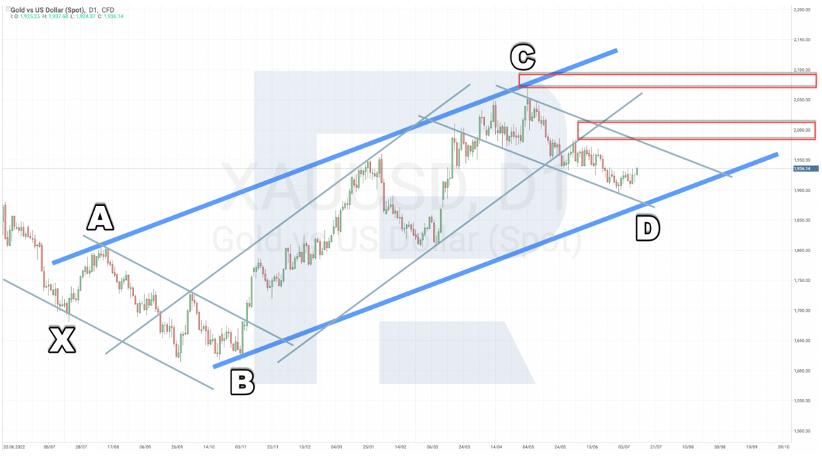 Z hlediska technické analýzy se současná nová struktura podobá vytvoření vzestupného vzoru 5-0 , který se skládá z pěti bodů. První bod X se tvořil kolem 1,685 USD, po kterém následoval růst ceny. Bod A se nachází na úrovni 1 806 USD a po jeho vytvoření cena klesla a bod X narazil na nové minimum. Bod B vznikl vedle 1 620 USD. Následoval agresivní nárůst ceny na úroveň 2 078 USD a zde se vytvořil bod C.