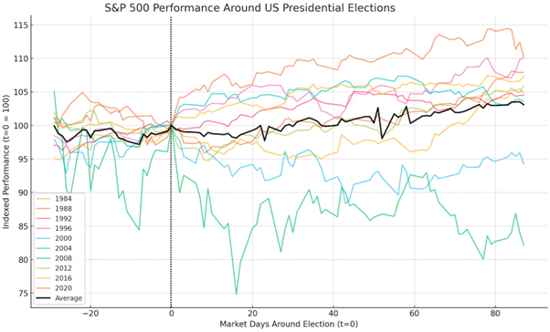 Historická data naznačují, že volby obvykle zvyšují volatilitu na trzích. Analýza ukazuje, že předvolební období často provází výrazný pokles volatility měřené indexem VIX, který může trvat až do konce roku.