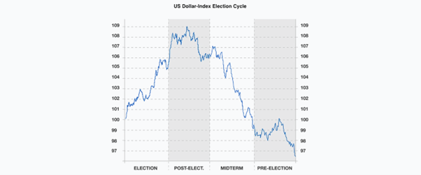 Historicky vzato, dolar vykazuje nejlepší výkonnost ve volebních letech, zatímco v povolebních letech má tendenci oslabovat.