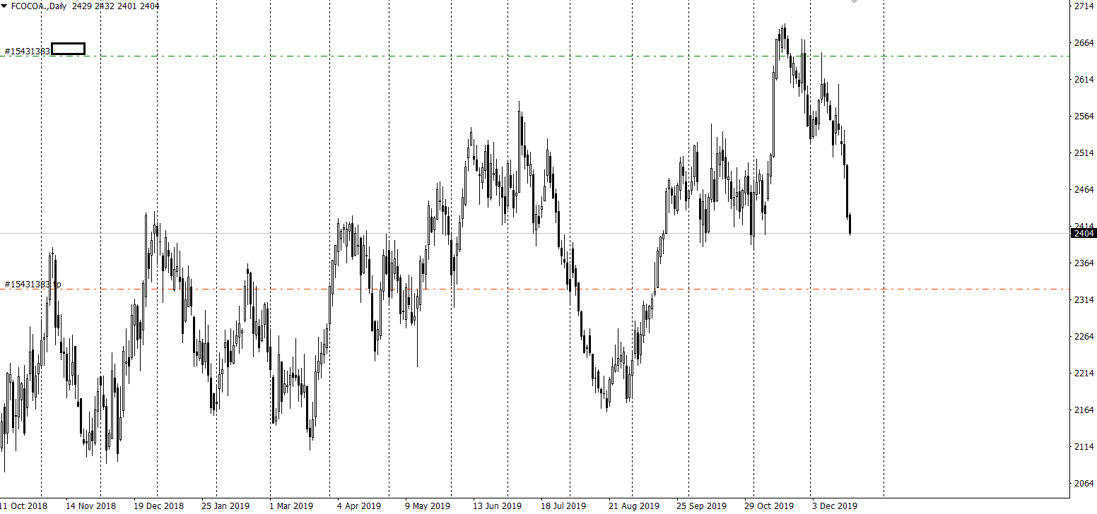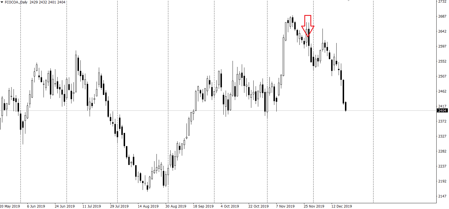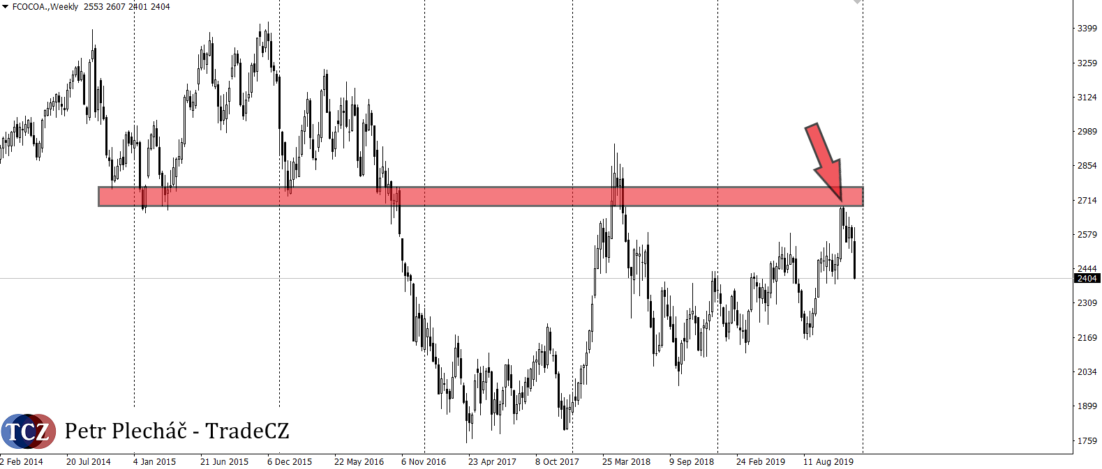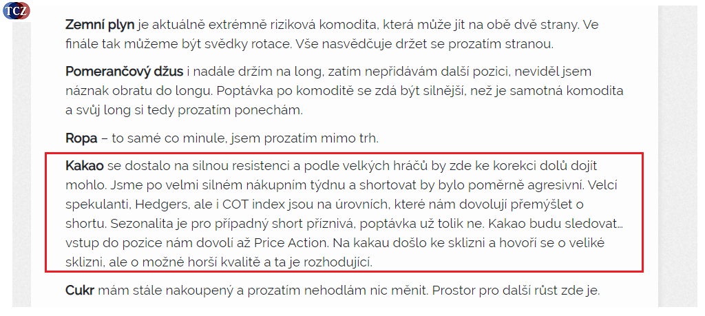Vše začalo komentářem v PWFT klubu, kde každý týden procházím všechny známé komodity a rozebírám obchodní příležitosti a své otevřené obchody. V polovině listopadu 2019 se v mém hledáčku objevilo kakao a já jej popsal následovně.