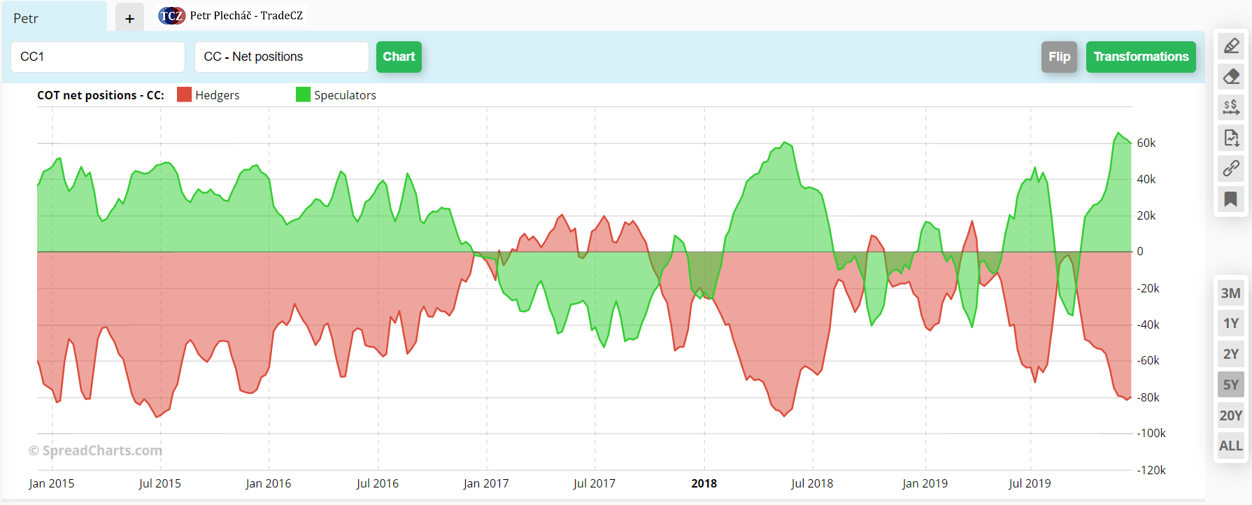 Před vstupem do obchodu řešíme mnoho otázek z Techniky COT. Tady bych rád zmínil pozice velkých spekulantů a hedgers, kteří se nacházeli na extrémních hodnotách a věřím, že také díky tomu se nám podařilo vychytat obrat na trhu s kakaem.