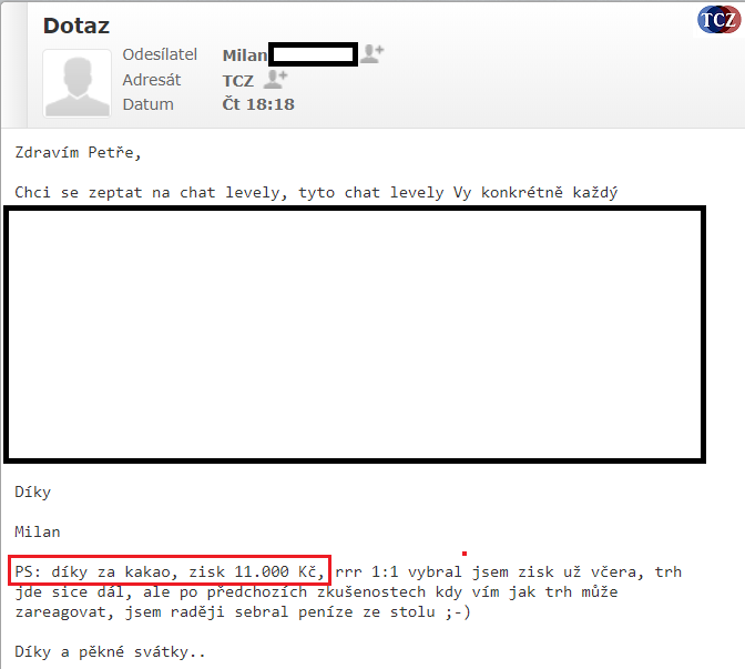 Trader Milan z PWFT klubu se mi před pár dny pochlubil hezkým výdělkem, který na zmíněném kakau zrealizoval. Obchod zavíral dokonce kolem 2 495, takže mu utekl ten následný silný výprodej. I přesto si z obchodu odnesl 11 000 Kč, ale je nutné zmínit, že jeho obchodní účet pravděpodobně bude dosahovat více než jen pár desítek tisíc korun.