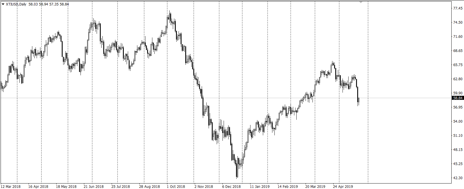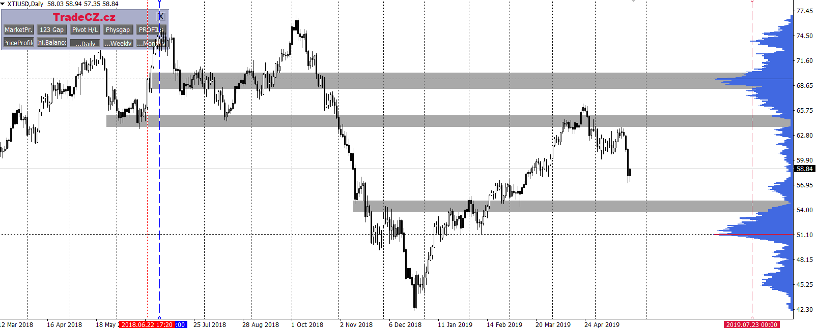 Při dalším poklesu ceny ropy můžeme hledat první důležitý support na ceně okolo 54 USD. Tato cena momentálně funguje pro trh jako magnet a zároveň jako bariéra pro další postup dolů. Aktuálně trh reaguje na slabší profil.