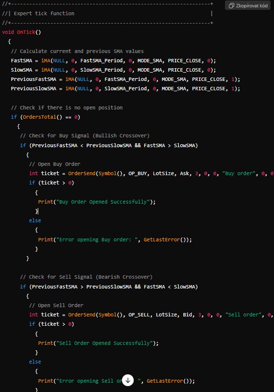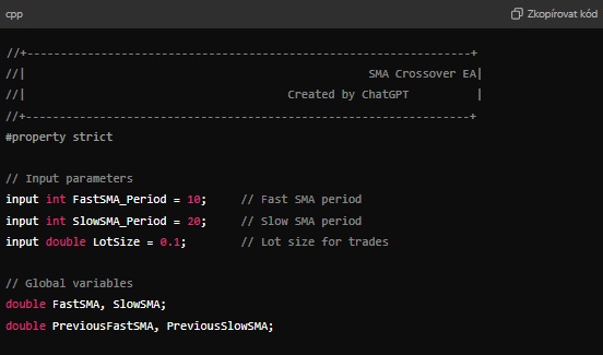 Naši obchodní strategii, v jejímž rámci využíváme křížení klouzavých průměrů, necháme zakódovat do EA určeného pro platformu Meta Trader 4. Výsledný kód nám ChatGPT zobrazí v ucelené podobě, ale my si nyní popíšeme jednotlivé části kódu. Pokud máte již strategii vytvořenou a to v textové podobě, stačí zadat ChatGPT jednoduchý pokyn ke generování EA. Tím pokynem může být například „Show me EA for Meta Trader 4„. Na základě tohoto pokynu bude vytvořen váš první algoritmický obchodník.