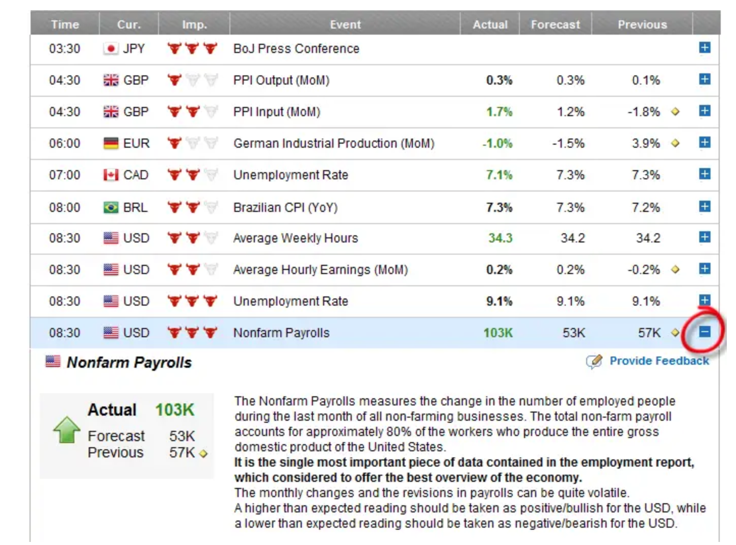 - Actual – Skutečné vydání (Zelená znamená lepší, než se očekávalo, zatímco červená znamená horší, než se očekávalo. Černá znamená podle očekávání).