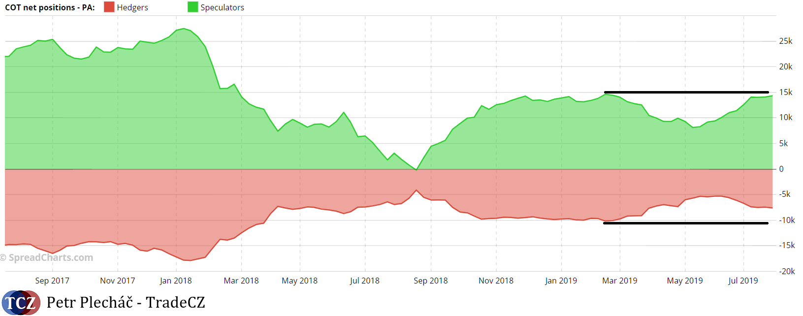 Palladium jsme spolu s dalšími tradery v PWFT klubu shortovali. Jak je vidno, pozice velkých spekulantů dosáhly předchozích maxim, ale zajišťovatelé takový strach z dalšího růstu neměli.