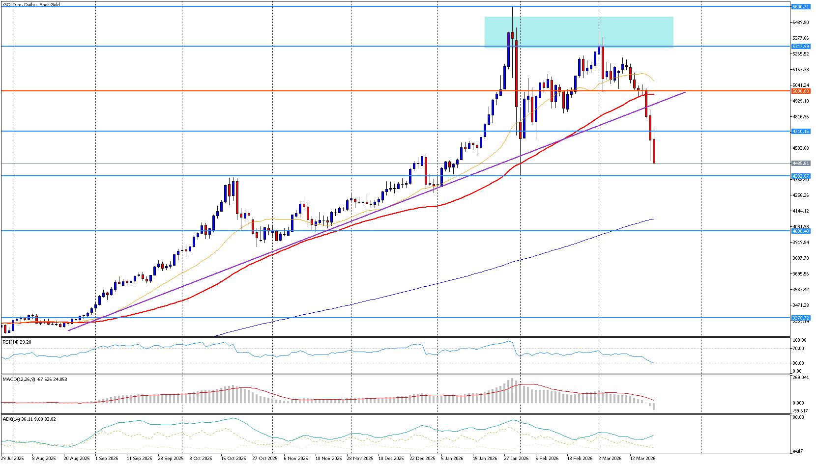 Tento souběh vedl k výraznému poklesu přibližně o 13 %, což představuje největší týdenní propad od února 2020. Drahý kov se v důsledku tohoto vývoje dostal až k úrovni kolem 4 485 USD, tedy na nejnižší hodnoty za posledních sedm týdnů, a přiblížil se klíčové psychologické hranici, než došlo k mírnému technickému odrazu. Současný vývoj otevírá otázku, zda prudká korekce, která začala z historického maxima 5 597 USD v březnu, již dosáhla svého dna. Technické indikátory naznačují určité známky stabilizace. Momentum se postupně odklání od přeprodaných úrovní směrem vzhůru, což podporuje hypotézu, že výprodej mohl být v krátkodobém horizontu přehnaný. Pozitivním signálem je také návrat ceny nad dříve prolomenou vzestupnou trendovou linii, která nyní funguje jako podpora. Přesto zůstává další růst podmíněný překonáním důležitých rezistenčních úrovní. První klíčová bariéra se nachází v oblasti 4 718–4 735, kde prochází krátkodobá klesající trendová linie. Teprve její průlom by mohl potvrdit silnější obnovu býčího momenta. Nad touto zónou se další rezistence objevuje poblíž 4 850. Následně by se pozornost trhu přesunula k psychologické hranici 5 000 a k trendové linii odporu v oblasti 5 016, přičemž mezilehlá úroveň 4 960 pravděpodobně nepředstavuje zásadní překážku. Naopak v případě obnovení prodejního tlaku zůstává klíčovou úrovní podpora kolem 4 450. Její prolomení by mohlo znovu aktivovat medvědí sentiment a otevřít prostor k poklesu směrem k 4 392. Další podpůrná zóna se nachází poblíž 4 300, zatímco hlubší korekce by mohla najít oporu až v oblasti kolem 4 000. Celkově se zdá, že trh se zlatem nachází ve fázi stabilizace po výrazném výprodeji, avšak potvrzení obratu zatím chybí. Pro obnovení důvěry kupců bude klíčové, zda se ceně podaří rozhodně překonat oblast 4 718–4 735, jinak zůstává riziko další volatility a návratu prodejního tlaku.