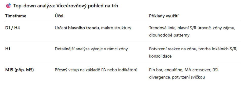 Profesionálové nekoukají jen na jeden graf. Začínají na vyšších časových rámcích (D1, H4), aby určili hlavní trend, přejdou na střední (H1) pro detailnější strukturu a na nízkých (M15) hledají ideální vstup.